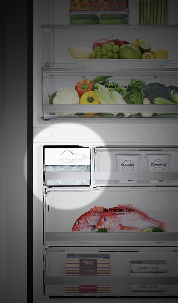 *Basado en una prueba de UL que compara el tiempo de enfriamiento de los cajones de la puerta de 25℃ a 7℃ entre el modelo LGE Non-DoorCooling+ de J822MT75 y el modelo DoorCooling+ de J823MT75, según el método de prueba interno de LG. El resultado puede variar dependiendo del uso real.